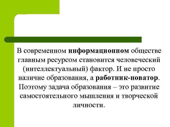 В современном информационном обществе главным ресурсом становится человеческий (интеллектуальный) фактор. И не просто наличие образования, а работник-новатор. Поэтому задача образования – это развитие самостоятельного мышления и творческой личности.