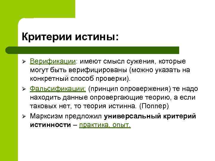 Критерии истины: Ø Ø Ø Верификации: имеют смысл сужения, которые могут быть верифицированы (можно указать на конкретный способ проверки). Фальсификации: (принцип опровержения) те надо находить данные опровергающие теорию, а если таковых нет, то теория истинна. (Поппер) Марксизм предложил универсальный критерий истинности – практика, опыт.