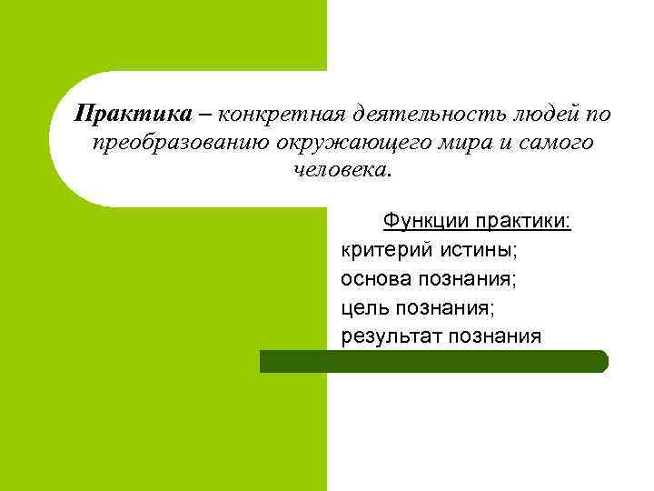 Практика – конкретная деятельность людей по преобразованию окружающего мира и самого человека. Функции практики: критерий истины; основа познания; цель познания; результат познания