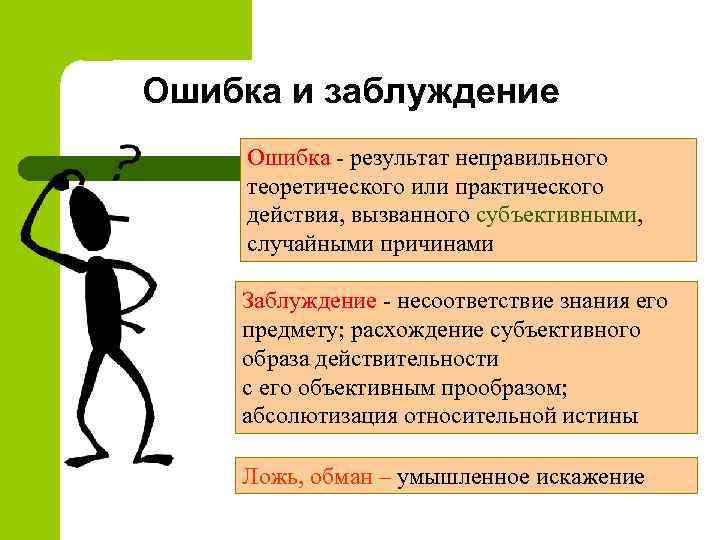 Ошибка и заблуждение Ошибка - результат неправильного теоретического или практического действия, вызванного субъективными, случайными причинами Заблуждение - несоответствие знания его предмету; расхождение субъективного образа действительности с его объективным прообразом; абсолютизация относительной истины Ложь, обман – умышленное искажение