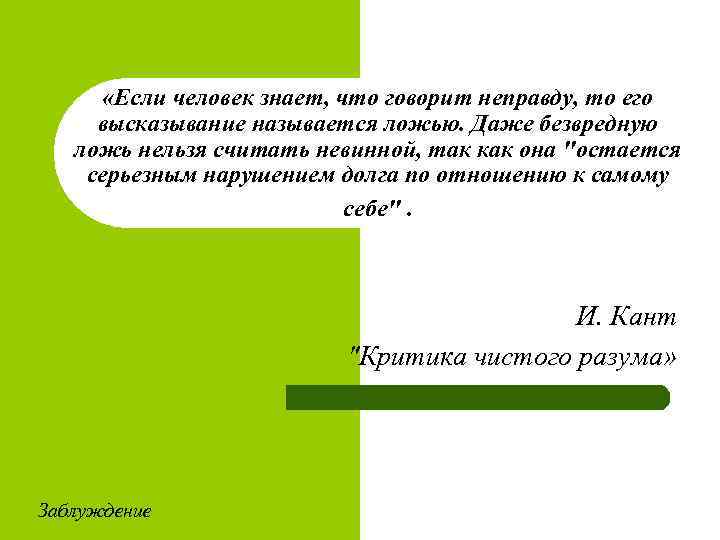 «Если человек знает, что говорит неправду, то его высказывание называется ложью. Даже безвредную ложь нельзя считать невинной, так как она "остается серьезным нарушением долга по отношению к самому себе". И. Кант "Критика чистого разума» Заблуждение