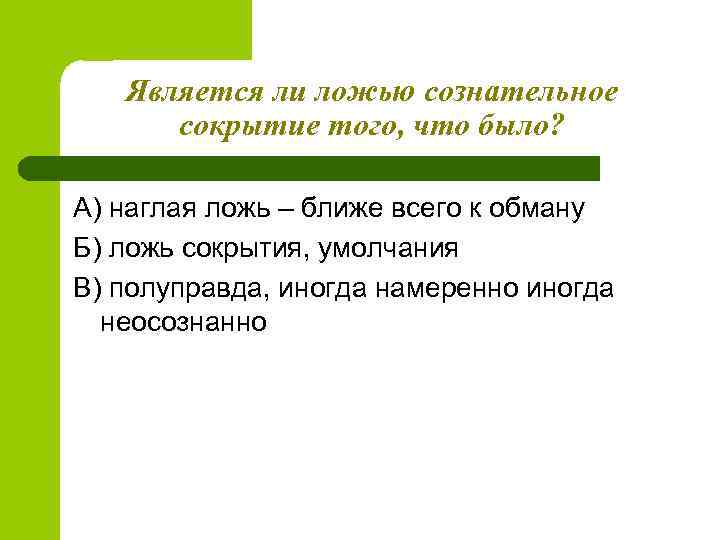 Является ли ложью сознательное сокрытие того, что было? А) наглая ложь – ближе всего к обману Б) ложь сокрытия, умолчания В) полуправда, иногда намеренно иногда неосознанно