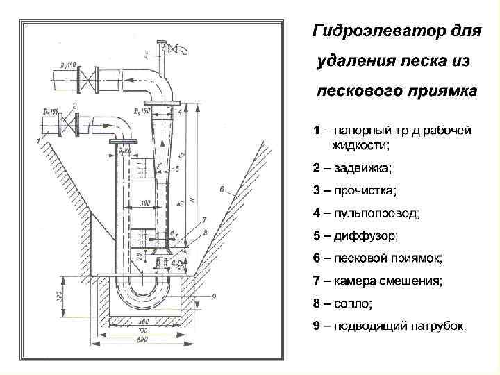 Горизонтальные песколовки с круговым движением воды Q до 70 тыс. м 3/сут D=4, 6 м • • • • 1 -гидроэлеватор; 2 тр д для отвода всплывающих примесей; 3 желоб; 4 затворы с ручным приводом; 5 подводящий лоток; 6 пульпопровод; 7 тр д для рабочей жидкости; 8 камера переключения; 9 устройство для сбора всплывающих примесей; 10 отводящий лоток; 11 полупогружные щиты при очистке жиро нефтесодержащих вод.