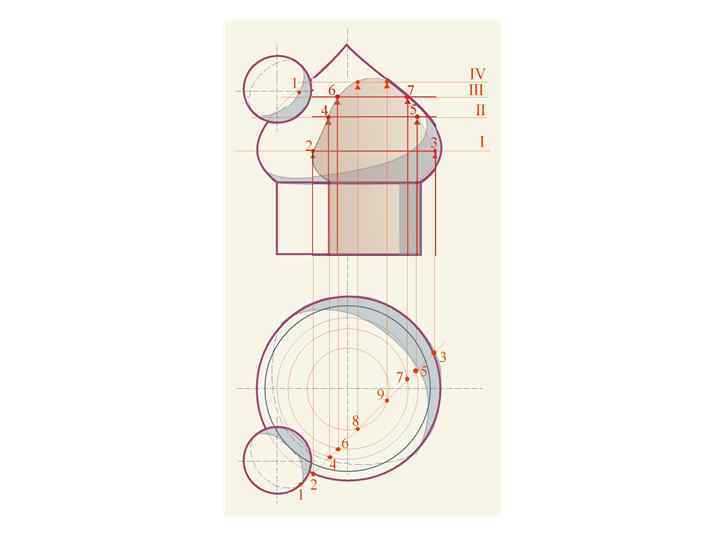 Несколько лучевых сечений, проведенных из опорных точек на контуре собственной тени одной проекции позволяют определить точки падающей тени /точки пересечения луча 45º с контуром лучевого сечения/ от сферы на купол на другой проекции