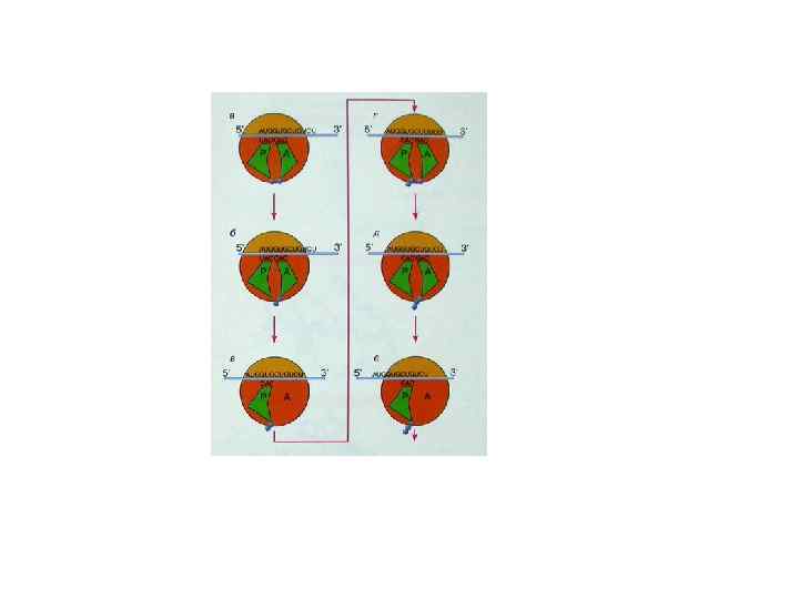 Терминация трансляции а – после добавления последнего (С-концевого) аминокислотного остатка к растущему полипептиду, т. е. образования последней полипептидной связи, и завершающей транслокации, в А-участке устанавливается триплет, не кодирующий никакой аминокислоты – кодон терминации (UAG, UAA или UGA). Завершенный полипептид остается ковалентно связанным с т. РНК, которая принесла последний аминокислотный остаток в Rs; б – А-участок с кодоном терминации воспринимает специальные белки – факторы терминации, release factors (RF – recognize - узнавать). У бактерий RF 1 (узнает UAA, UAG) или RF 2 (UAA, UGA), непосредственно узнающие кодон терминации на малой субчастице Rs, и RF 3, взаимодействующий с большой субчастицей Rs вблизи пептидилтрансферазного центра. У эукариот e. RF 1, e. RF 3 – работают вместе и узнают все стоп-кодоны; в – пептидилтрансферазный центр под действием факторов терминации катализирует реакцию переноса С-конца синтезированного полипептида от т. РНК на молекулу воды: происходит гидролиз связи между т. РНК и полипептидом и полипептид высвобождается из Rs в среду; г – далее, вероятно вследствие гидролиза ГТФ, связанного с RF 3, деацилированная т. РНК освобождается из Rs; д – «пустая» Rs легко диссоциирует на субчастицы, причем малая субчастица может некоторое время оставаться в лабильной ассоциации с м. РНК и скользить вдоль нее, находя следующий кодон инициации (реинициация следующей кодирующей последовательности в полицистронных м. РНК). Удалению деацилированной т. РНК и диссоциации Rs может содействовать специальный белок – фактор освобождения (RRF). В большинстве случаев м. РНК содержащая стоп-кодоны, транслируется только раз (или несколько раз) перед тем как будет узнана и разрушена в процессе nonsence-mediated decay (NMD).
