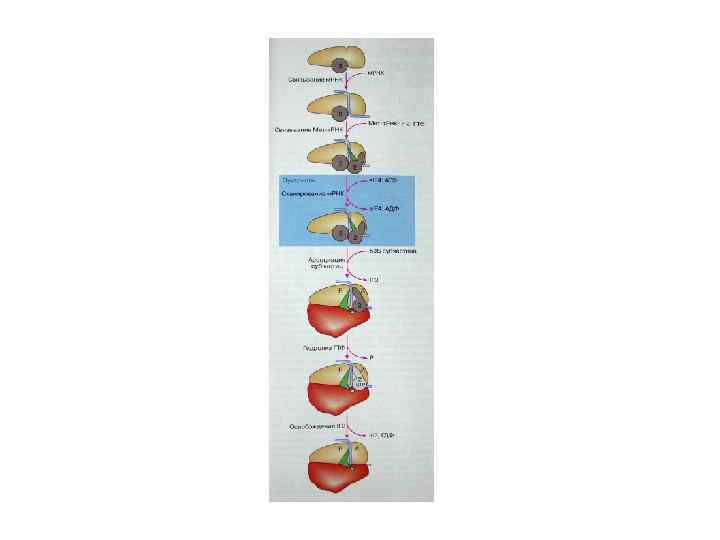 Расположение функциональных центров на малой и большой субчастицах рибосомы Цепь м. РНК связана с малой субчастицей (вверху) в районе ее «шеи» и протягивается через этот м. РНКсвязывающий центр в ходе трансляции от 5’ к 3’ концу. Две молекулы т. РНК занимают А- и Р- участки на малой субчастице, будучи связаны своими антикодонами с двумя смежными кодонами м. РНК в районе «шеи» малой субчастицы. Пептидилтрансферазный центр (РТС) расположен в районе «шеи» (в бороздке под центральным выступом) большой субчастицы (внизу). Когда субчастицы ассоциированы, акцепторные концы двух т. РНК с их аминоацильным и пептидильным остатками взаимодействуют с пептидилтрансферазным центром большой субчастицы. Факторы элонгации EF 1 и EF 2 связываются в районе палочкообразного бокового выступа большой субчастицы со стороны, обращенной к малой субчастице.