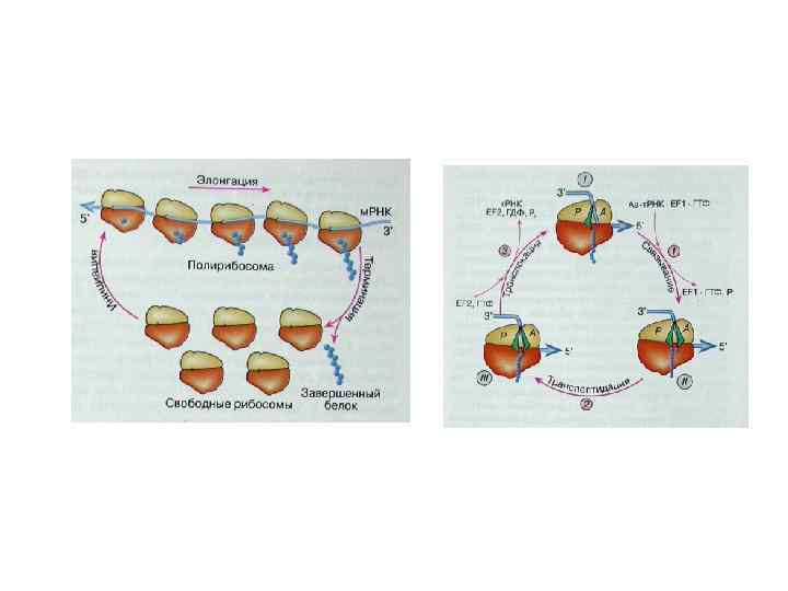 Модель динамической работы рибосомы в элонгационном цикле Две рибосомные субчастицы подвижно соединены друг с другом и способны к некоторому размыканию и смыканию. Размыкание открывает функциональные центры на контактирующих поверхностях субчастиц, такие, как А-учаток для приема аа-т. РНК, и способствует перемещению лигандов, например в ходе транслокации. Смыкание субчастиц запирает лиганды внутри рибосомы и приводит в тесный контакт субстраты для реакции транспептидации. Предполагается, что размыкание индуцируется факторами элонгации с ГТФ, а гидролиз ГТФ и уход факторов с рибосомы позволяют ей снова сомкнуться. 1 – связывание аа-т. РНК с Rs требует размыкания, и фактор элонгации EF 1 с ГТФ призван открыть Rs; 2 – после расщепления ГТФ фактор элонгации EF 1 покидает Rs, а аминоацильный конец аа-т. РНК взаимодействует с пептидилтрансферазным центром большой субчастицы и тем самым способствует смыканию субчастиц и запиранию Rs; 3 – реакция транспептидации происходит в «закрытой» Rs между тесно сближенными группами двух субстратов – пептидил-т. РНК и аминоацил-т. РНК; 4 – размыкание мотируется фактором элонгации EF 2 с ГТФ, что приводит к выходу деацилированной т. РНК и смещению остатка т. РНК молекулы пептидл-т. РНК вместе с м. РНК; 5 – гидролиз ГТФ и как следствие уход фактора элонгации EF 2 снова дает возможность Rs сомкнуться. Таким образом, транслирующая Rs в ходе элонгационного цикла осциллирует между сомкнутым и разомкнутым состояниями.