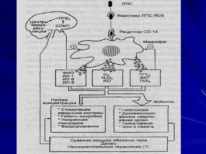 ЛИХОРАДКА БАКТЕРИЯ → LPS → МАКРОФАГ → ИНТЕРЛЕЙКИНЫ → МОЗГ → СИНТЕЗ PGE 2 → ПРЕОДАЛЕНИЕ ГЭБ → ГИПОТАЛАМУС → ПОВЫШЕНИЕ SET POINT→ ВАЗОКОНСТРИКЦИЯ И
