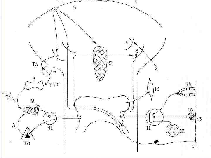 ТЛ – тиреолиберин ТТГ – тиреотропный гормон Т 3 и Т 4 - три- и тетрайодтиронины А – адреналин