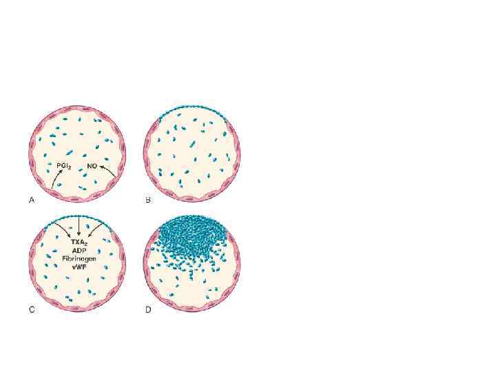 Запомните ! Наиболее важными факторами, обеспечивающими первичный гемостаз, являются: 1. число тромбоцитов в крови; 2. фактор Виллебранда; 3. наличие в мембранах тромбоцитов специфического рецептора (гликопротеина Ib), обеспечивающего вместе с фактором Виллебранда адгезию пластинок к коллагеновым волокнам поврежденного сосуда; 4. наличие в мембранах активированных тромбоцитов рецепторов (гликопротеины IIb и IIIa), вступающих в специфическую реакцию с фибриногеном тромбоспондином и другими белками, что имеет значение в формировании необратимой агрегации пластинок. 5. нормальный синтез в тромбоцитах из арахидоновой кислоты тромбоксана А 2 и простациклина.