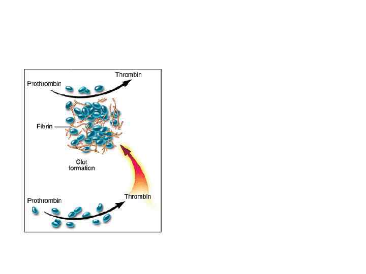 • В зоне первичного гемостаза образуются вначале малые количества тромбина, который с одной стороны завершает процесс необратимой агрегации тромбоцитов, а с другой способствует образованию фибрина, который вплетается в тромбоцитарный сгусток и уплотняет его.