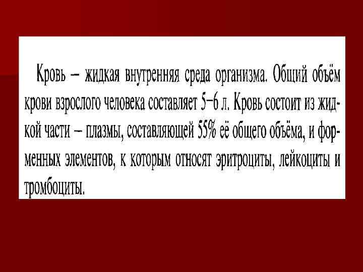 n Кровь – клейкая, густая непрозрачная жидкость красного цвета является жидкой тканью, осуществляющей взаимосвязь всех органов и тканей.