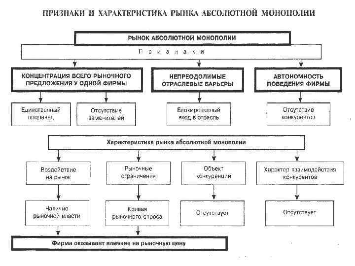 Абсолютная монополия • рыночная ситуация, при которой на рынке фактически действует единственная фирма, обеспечивающая общество необходимой продукцией, любое проявление соперничества полностью исключается. Абсолютная монополия имеет следующие особенности: 1) На рынке действует один производитель, он самостоятельно устанавливает цены на продукцию, которую реализует, и полностью контролирует всю торговую деятельность и рыночные сделки. 2) Если на рынке действует монополист с абсолютной властью, другие фирмы оказываются вне конкуренции: доступ на рынок им закрыт. 3) Перемещения трудовых и иных ресурсов и факторов производства носят структурированный характер, их мобильность ограничена. 4) Продукция монополиста абсолютно уникальна и не имеет аналогов и, кроме того, она имеет товарный знак.