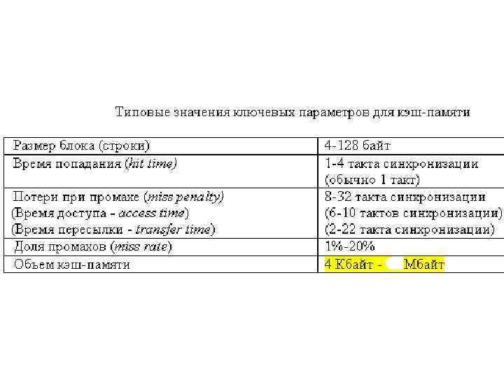 время поиска Кэш с прямым отображением Полностью ассоциативный кэш Множественноассоциативный кэш вероятность присутствия необходимой информации минимальное минимальная максимальное максимальная оптимальная производительность