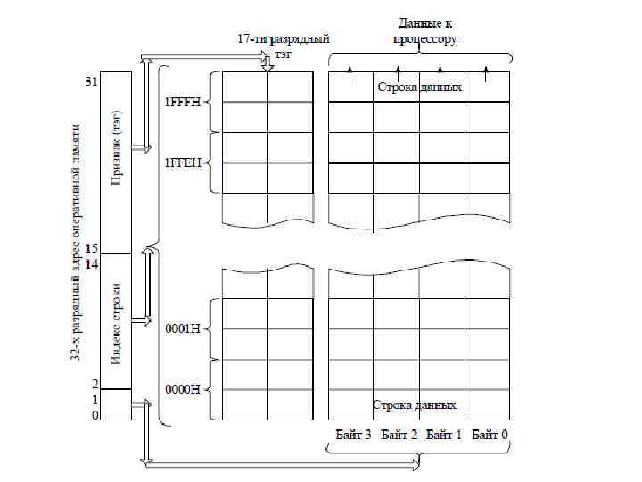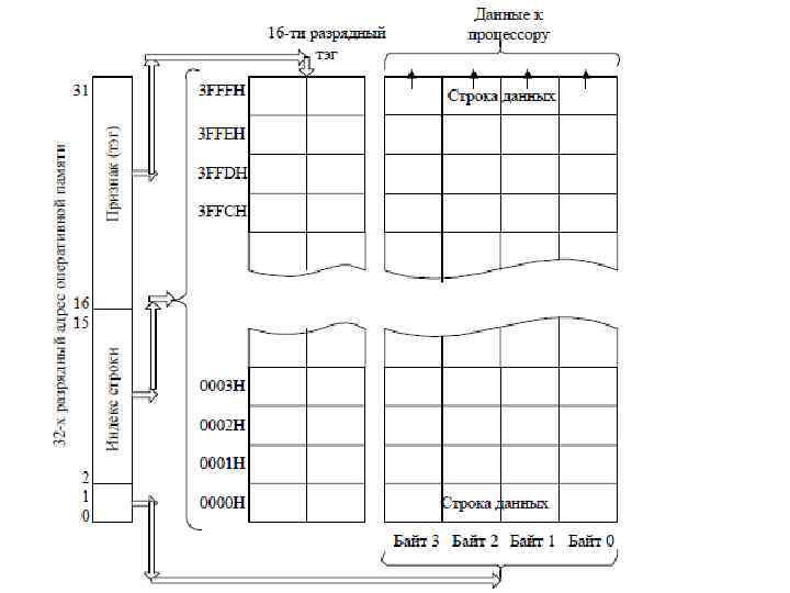 В соответствии с этим адрес ОП можно разбить на два поля: • младшие 16 разрядов - индекс, • старшие 16 разрядов - признак. Индекс определяет адрес кэш-памяти (строку кэша), а признак позволяет отличить один блок ОП от другого при записи в некоторую строку буфера. Хранится он в специальной памяти признаков.