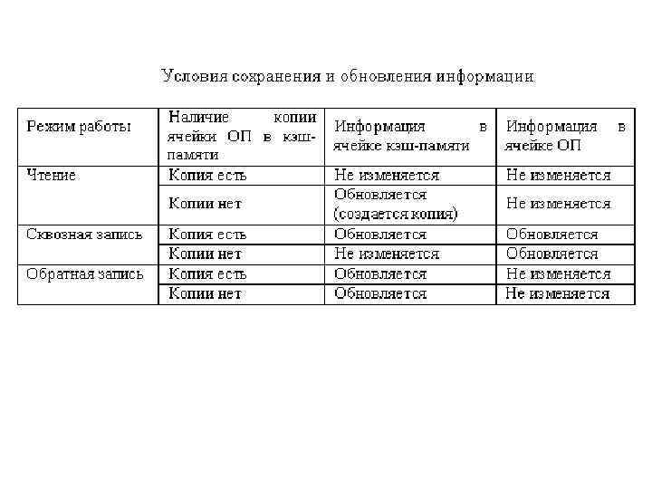 Методы обновления строк в ОП ЧТЕНИЕ из кэш Если процессору требуется информация из некоторой ячейки ОП, а копия этой ячейки уже есть в кэш, то вместо оригинала считывается копия. В этом случае информация ни в кэш, ни в ОП не изменяется.
