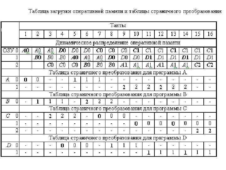 Рассмотрим пример преобразования адреса ВС в адрес ФС. Пусть VОЗУ = 3 и Vстр=1. Пусть коэффициент мультипрограммирования равен четырем. Переключение между программами происходит через tk = 1. Время выполнения каждой страницы любой программы t = 2 tk. Полагаем, что страницы программ загружаются в ОП по мере их необходимости и, по возможности, в свободные области ОЗУ. Если вся ОП занята, то новая страница замещает ту, к которой дольше всего не было обращений (LRU). Пусть выполняемые программы имеют следующее количество страниц: VA=2, VB=1, VC=3, VD=2.