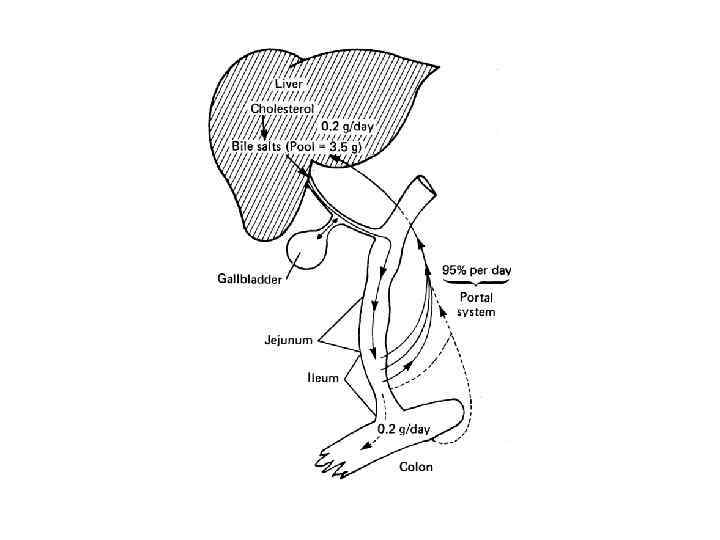 Кишечно-печеночная циркуляция жёлчных солей • Сколько раз за день пул жёлчных солей (ЖС) циркулирует между кишечником и печенью, зависит от содержания жира в пище. • При нормальной пище пул ЖС циркулирует 2 раза в день, • При богатой жирами пище - 5 раз и больше • На рисунке дано приблизительное представление