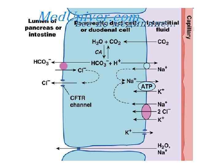 Механизм секреции Na. HCO 3 в клетках протока поджелудочной железы • НСОз- попадает в проток железы с помощью анионного обмена c Cl- (пассивный антипорт) • Параллельно подключённый Cl--канал обеспечивает рециркуляцию Cl--канал (CFTR — Cystic Fibrosis Transmembrane Conductance Regulator) • Необходим Na+/H+ антипорт через базолатеральную мембрану • Транспорт НСОз- зависит от Na+/К+-АТФазы на базолатеральной мембране • Жидкость в протоке заряжается отрицательно по отношению к интерстициальной (выход Cl- в просвет протока и проникновение К+ в клетку через базолатеральную мембрану), что способствует пассивной диффузии ионов Na+ в проток железы по межклеточным плотным контактам.