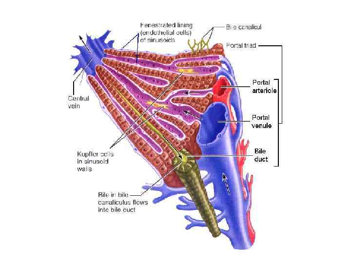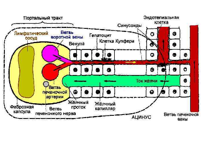 Схема взаимного расположения кровеносных сосудов, гепатоцитов и желчных канальцев