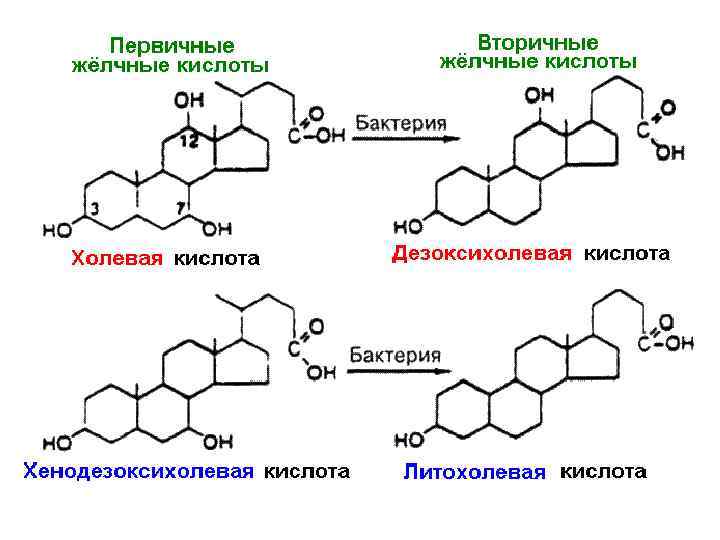 • Этапы, которые приводят к образованию холевой кислоты, отличаются от этапов образования хенодезоксихолевой кислоты. • Фактически эти кислоты не превращаются одна в другую, во всяком случае у людей.