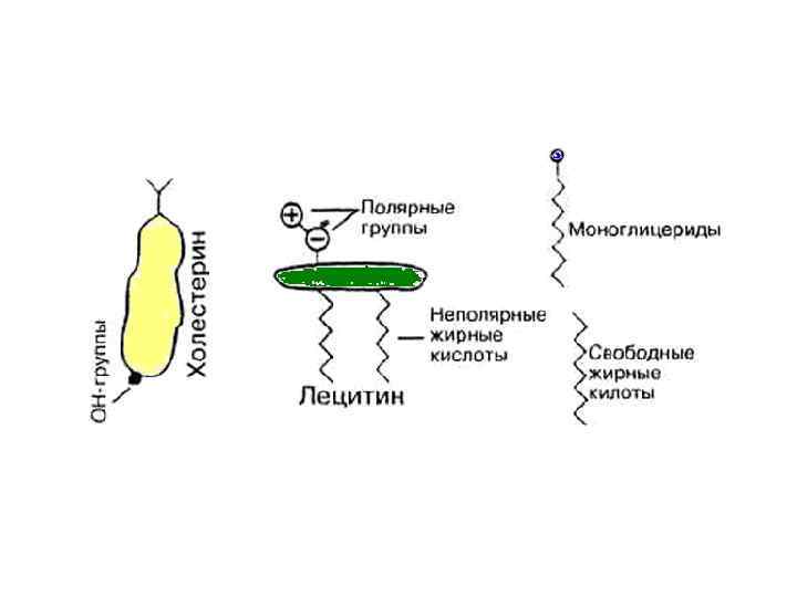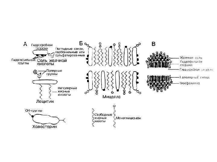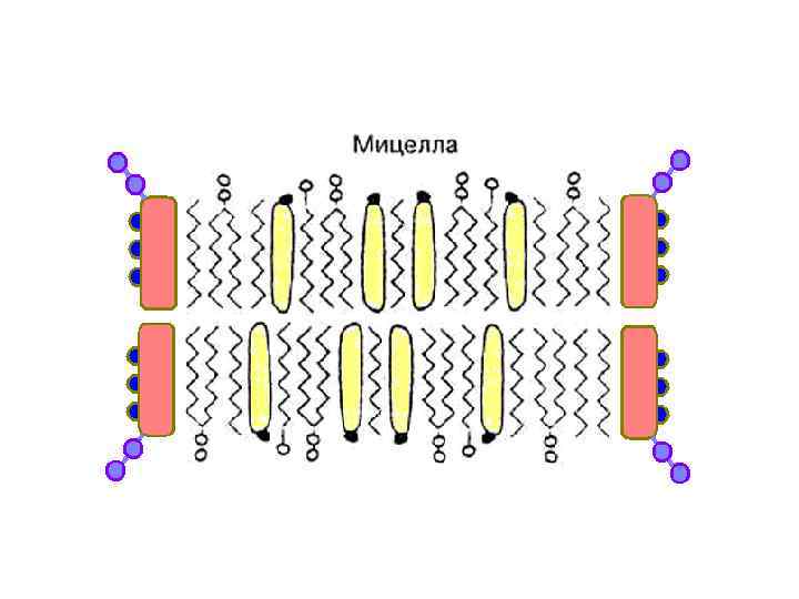 Строение смешанной мицеллы Сердцевина мицеллы, состоящая из холестерола, лецитина, жирных кислот и моноглицеридов, покрыта снаружи жёлчными кислотами, гидрофильные группы которых находятся на поверхности мицеллы