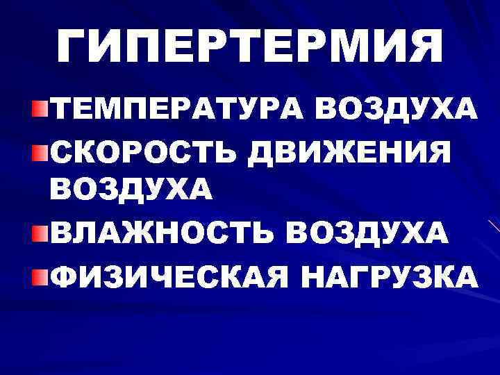 ГИПЕРТЕРМИЯ ТЕМПЕРАТУРА ВОЗДУХА СКОРОСТЬ ДВИЖЕНИЯ ВОЗДУХА ВЛАЖНОСТЬ ВОЗДУХА ФИЗИЧЕСКАЯ НАГРУЗКА