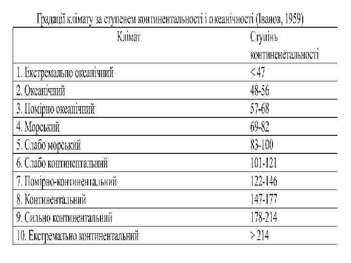 Н. Н. Іванова (1959) • Отримані величини розподіляються таким чином, що проміжний клімат, при якому морські і континентальні впливи урівноважуються або зникають відповідає 100%. Аj –річна амплітуда, Ат – добова амплітуда температури, Df – дефіцит насиченняпоказник віддаленості від океану, φ – географічна широта. • Мінімум, рівний 37%, розташований біля острова Маккуорі, південніше Нової Зеландії. • Максимум (250 -260%) знаходиться в Центральній Азії і центральній Сахарі.