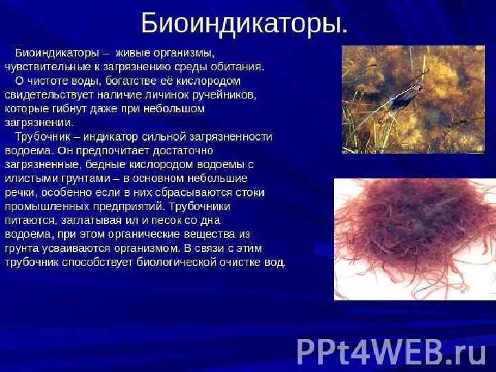 ОПРЕДЕЛЕНИЕ УРОВНЯ ЗАГРЯЗНЕНИЯ На загрязнения могут указывать такие признаки, как мёртвая рыба, но есть и более сложные методы его обнаружения. Загрязнение пресной воды измеряется по не менее чем 15 показателям, в итоге вода относится к одному из классов загрязнённости. Один из показателей - биохимическое потребление кислорода (БПК) — то есть сколько кислорода поглощает загрязнитель из воды. Этот показатель позволяет оценить степень кислородного голодания водных организмов.