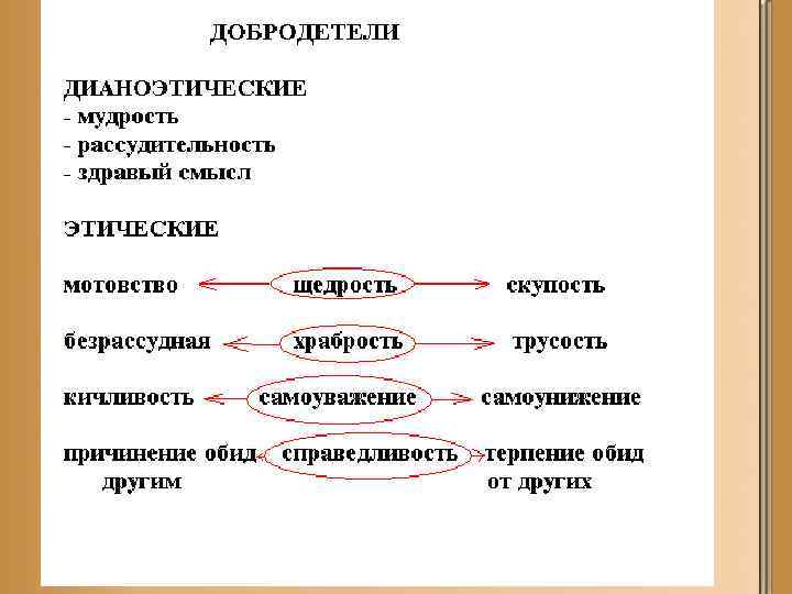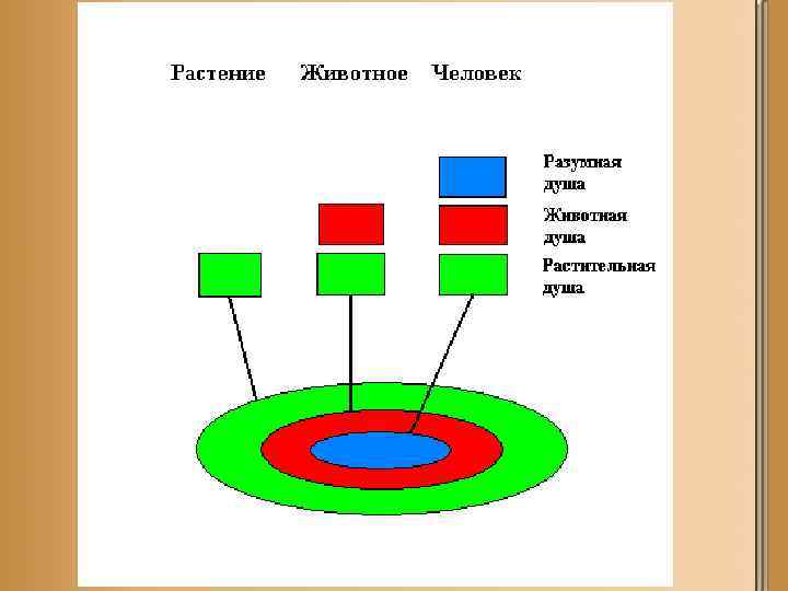 Ø Ø § § § Ø Ø Материя — это потенция, ограниченная формой (например, медный шар — это медь, ограниченная шарообразностью, и т. д. ). Касаясь данной проблемы, философ также приходит к выводам о том, что: все сущее на Земле обладает потенцией (собственно матери ей) и формой; изменение хотя бы одного из этих качеств (либо материи, либо формы) приводит к изменению сущности самого предмета; реальность — это последовательность перехода от материи к форме и от формы к материи; потенция (материал) есть пассивное начало, форма — активное; высшей формой всего сущего является Бог, имеющий бытие вне мира. Носителем сознания, по Аристотелю, является душа. Философ выделяет три уровня души: растительная душа; животная душа; разумная душа. Человек: по биологической сущности является одним из видов высокоорганизованных животных; отличается от животных наличием мышления и разума; имеет врожденную склонность жить в коллективе.