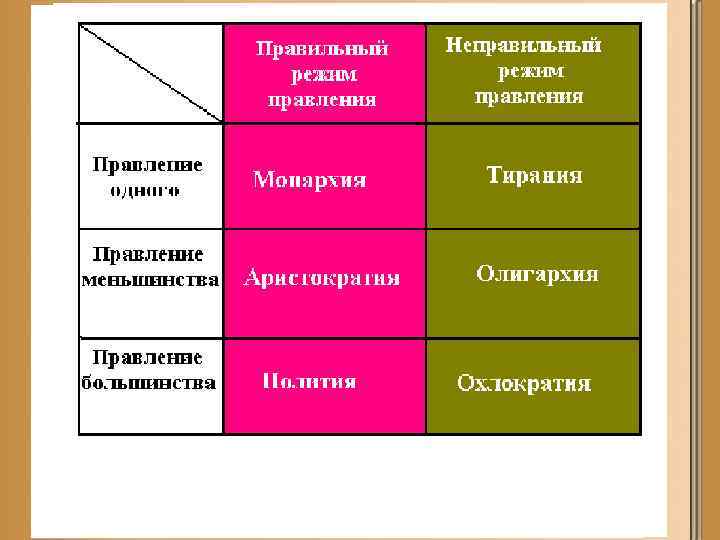 • Учения о познании : Ø поскольку материальный мир является всего лишь отображением "мира идей", то предметом познания должны стать прежде всего "чистые идеи"; Ø "чистые идеи" невозможно познать с помощью чувственного познания (такой тип познания дает не достоверное знание, а лишь мнение — "докса"); Ø "чистые идеи" можно познать лишь разумом, благодаря высшей духовной деятельности (идеалистическому познанию); Ø высшей духовной деятельностью могут заниматься только люди подготовленные — образованные интеллектуалы, философы, следовательно, только они способны увидеть и осознать "чистые идеи". • Платон выделяет семь типов государства: идеальное "государство будущего", которого пока не существует и в котором отпадет необходимость в государственной власти и законах, и шесть типов ныне существующих государств: • монархия — справедливая власть одного человека; • тирания — несправедливая власть одного человека; • аристократия — справедливая власть меньшинства; • олигархия — несправедливая власть меньшинства; • демократия — справедливая власть большинства; • тимократия — несправедливая власть большинства, власть военных вождей, армии.
