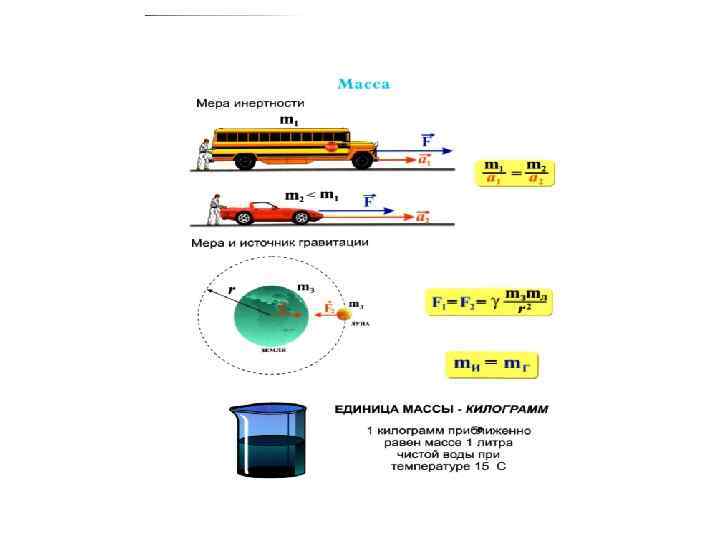 При одинаковых воздействиях различные тела неодинаково изменяют скорость своего движения, т. е. приобретают различные ускорения. Ускорение зависит не только от величины воздействия, но и от свойства самого тела (от его массы). Масса тела – физическая величина, являющаяся одной из основных характеристик материи, определяющая ее инерционные (инертная масса) и гравитационные (гравитационная масса) свойства. Доказано, что инертная и гравитационная массы равны другу (с точностью, не меньшей 10 -12 их значения) Масса – величина аддитивная (масса тела равна сумме масс частей, составляющих это тело).