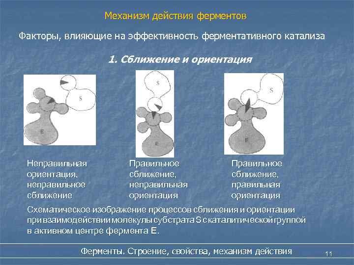 Механизм действия ферментов Факторы, влияющие на эффективность ферментативного катализа 1. Сближение и ориентация Неправильная ориентация, неправильное сближение Правильное сближение, неправильная ориентация Правильное сближение, правильная ориентация Схематическое изображение процессов сближения и ориентации при взаимодействии молекулы субстрата S с каталитической группой в активном центре фермента Е. Ферменты. Строение, свойства, механизм действия 11