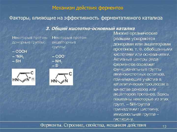 Механизм действия ферментов Факторы, влияющие на эффективность ферментативного катализа 2. Напряжение и деформация: индуцированное соответствие Индуцированное соответствие между активным центром фермента и напряженной формой молекулы субстрата Ферменты. Строение, свойства, механизм действия 12