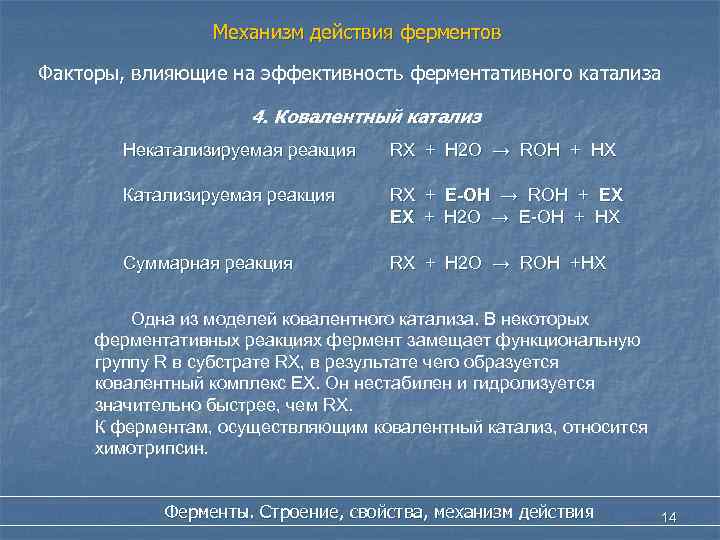 Механизм действия ферментов Факторы, влияющие на эффективность ферментативного катализа 3. Общий кuслотно-основный катализ Некоторые протондонорные группы: – СООН – +NH 3 – SH Некоторые протонакцепторные группы: – СОО– – NH 2 – S– Многие органические реакции ускоряются донорами или акцепторами протонов, т. е. обобщенными кислотами или основаниями. Активные центры ряда ферментов содержат функциональные группы аминокислотных остатков, принимающие участие в каталитических процессах в качестве доноров или акцепторов протонов. Здесь показаны некоторые из этих групп. – SН-группа принадлежит цистеину, имидазольная группа – гистидину. Ферменты. Строение, свойства, механизм действия 13