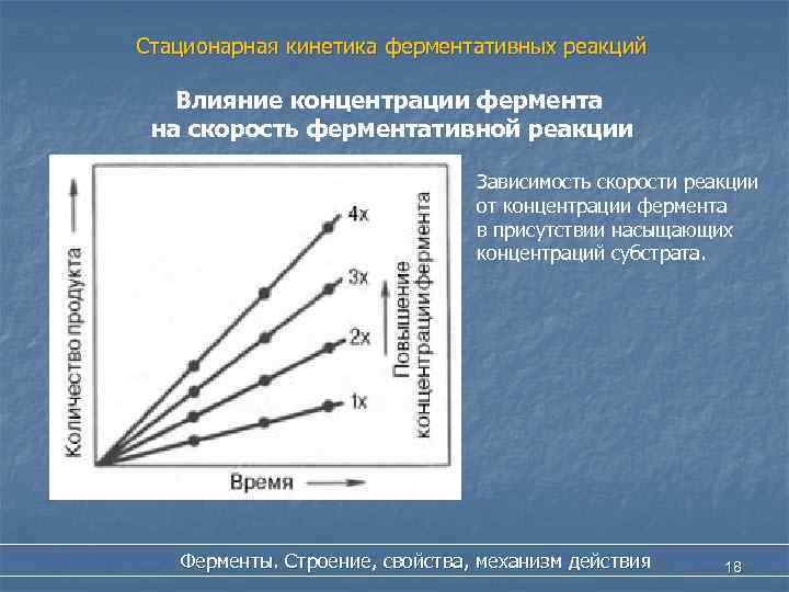 Стационарная кинетика ферментативных реакций Влияние концентрации фермента на скорость ферментативной реакции Зависимость скорости реакции от концентрации фермента в присутствии насыщающих концентраций субстрата. Ферменты. Строение, свойства, механизм действия 18