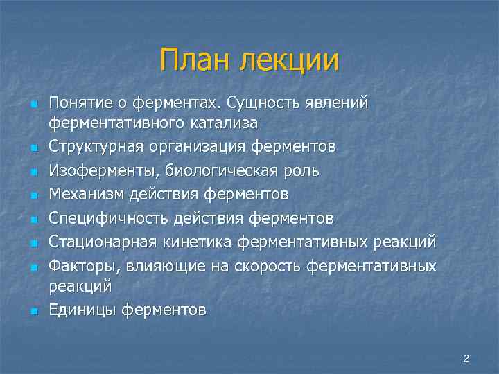 План лекции n n n n Понятие о ферментах. Сущность явлений ферментативного катализа Структурная организация ферментов Изоферменты, биологическая роль Механизм действия ферментов Специфичность действия ферментов Стационарная кинетика ферментативных реакций Факторы, влияющие на скорость ферментативных реакций Единицы ферментов 2