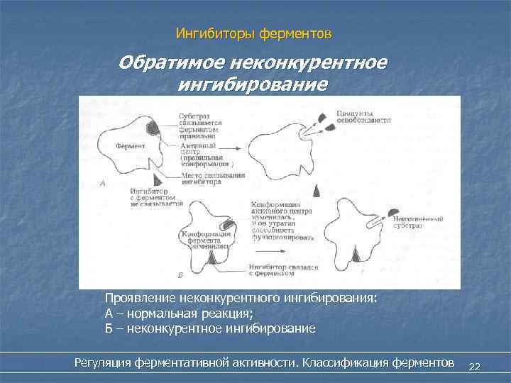 Ингибиторы ферментов Обратимое неконкурентное ингибирование Проявление неконкурентного ингибирования: А – нормальная реакция; Б – неконкурентное ингибирование Регуляция ферментативной активности. Классификация ферментов 22