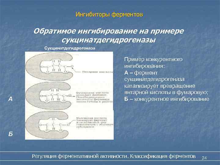 Ингибиторы ферментов Обратимое ингибирование на примере сукцинатдегидрогеназы Сукцинатдегидрогеназа А Пример конкурентного ингибирования: А – фермент сукцинатдегидрогеназа катализирует превращение янтарной кислоты в фумаровую; Б – конкурентное ингибирование Б Регуляция ферментативной активности. Классификация ферментов 24