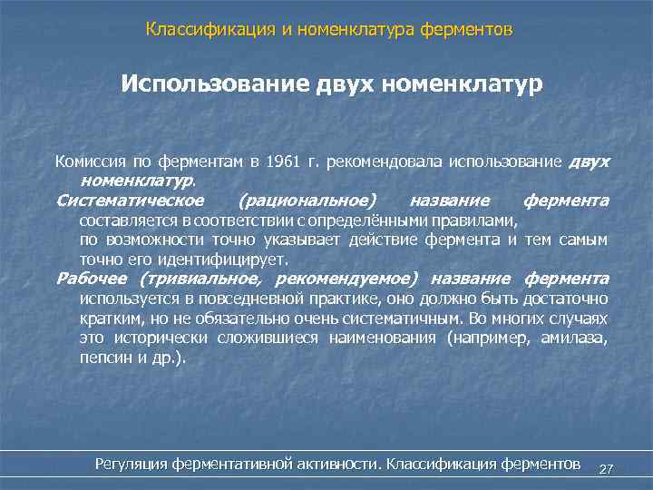 Классификация и номенклатура ферментов Использование двух номенклатур Комиссия по ферментам в 1961 г. рекомендовала использование двух номенклатур. Систематическое (рациональное) название фермента составляется в соответствии с определёнными правилами, по возможности точно указывает действие фермента и тем самым точно его идентифицирует. Рабочее (тривиальное, рекомендуемое) название фермента используется в повседневной практике, оно должно быть достаточно кратким, но не обязательно очень систематичным. Во многих случаях это исторически сложившиеся наименования (например, амилаза, пепсин и др. ). Регуляция ферментативной активности. Классификация ферментов 27