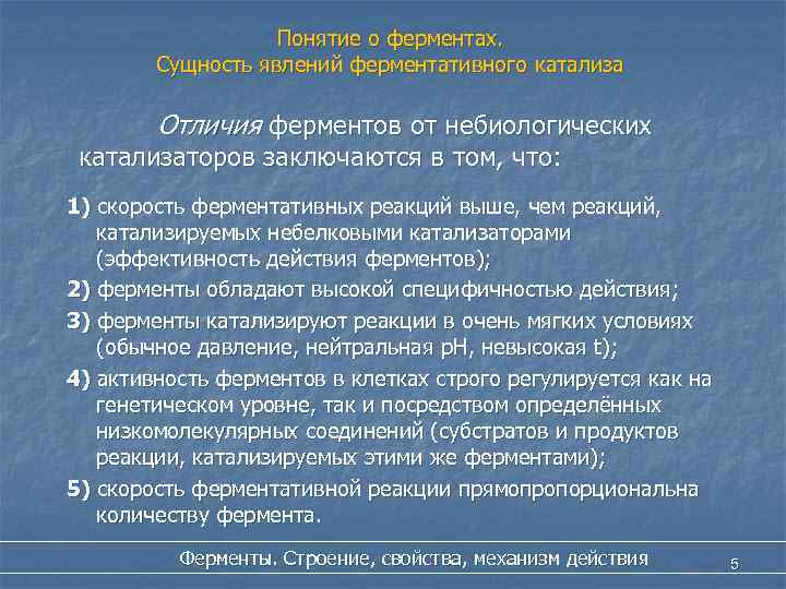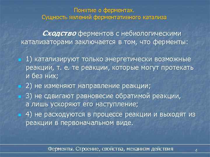 Понятие о ферментах. Сущность явлений ферментативного катализа Сходство ферментов с небиологическими катализаторами заключается в том, что ферменты: n n 1) катализируют только энергетически возможные реакции, т. е. те реакции, которые могут протекать и без них; 2) не изменяют направление реакции; 3) не сдвигают равновесие обратимой реакции, а лишь ускоряют его наступление; 4) не расходуются в процессе реакции и выходят из реакции в первоначальном виде. Ферменты. Строение, свойства, механизм действия 4