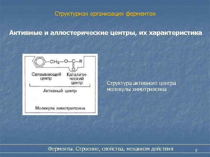 Структурная организация ферментов Активные и аллостерические центры, их характеристика Структура активного центра молекулы химотрипсина Ферменты. Строение, свойства, механизм действия 8