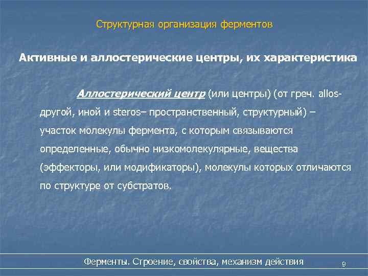 Структурная организация ферментов Активные и аллостерические центры, их характеристика Аллостерический центр (или центры) (от греч. allosдругой, иной и steros– пространственный, структурный) – участок молекулы фермента, с которым связываются определенные, обычно низкомолекулярные, вещества (эффекторы, или модификаторы), молекулы которых отличаются по структуре от субстратов. Ферменты. Строение, свойства, механизм действия 9
