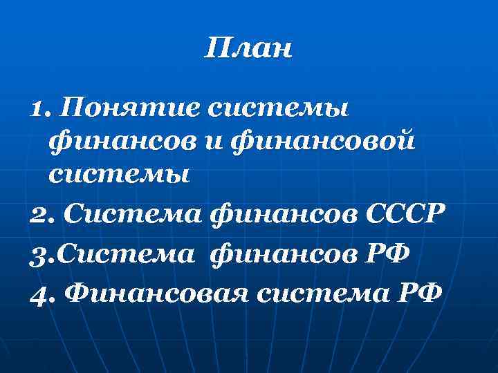 План 1. Понятие системы финансов и финансовой системы 2. Система финансов СССР 3. Система финансов РФ 4. Финансовая система РФ