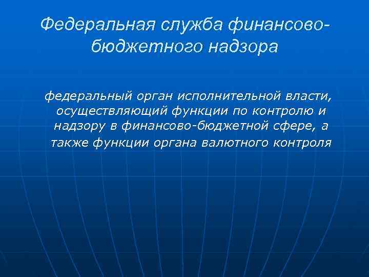 Федеральная служба финансово- бюджетного надзора федеральный орган исполнительной власти, осуществляющий функции по контролю и надзору в финансово-бюджетной сфере, а также функции органа валютного контроля