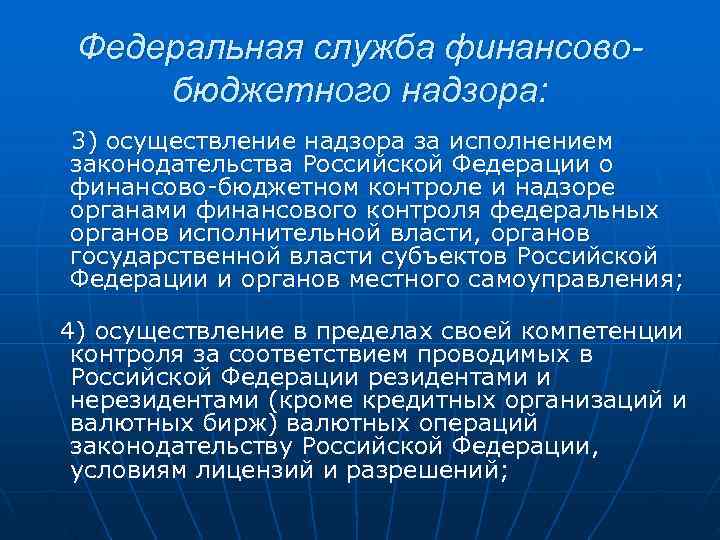 Федеральная служба финансово- бюджетного надзора: 3) осуществление надзора за исполнением законодательства Российской Федерации о финансово-бюджетном контроле и надзоре органами финансового контроля федеральных органов исполнительной власти, органов государственной власти субъектов Российской Федерации и органов местного самоуправления; 4) осуществление в пределах своей компетенции контроля за соответствием проводимых в Российской Федерации резидентами и нерезидентами (кроме кредитных организаций и валютных бирж) валютных операций законодательству Российской Федерации, условиям лицензий и разрешений;