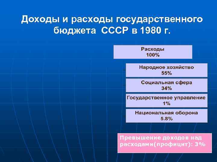 Доходы и расходы государственного бюджета СССР в 1980 г. Превышение доходов над расходами(профицит): 3%
