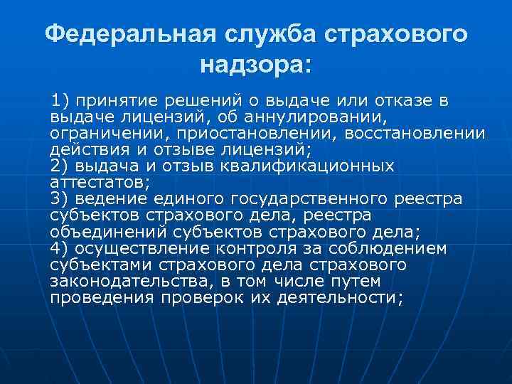 Федеральная служба страхового надзора: 1) принятие решений о выдаче или отказе в выдаче лицензий, об аннулировании, ограничении, приостановлении, восстановлении действия и отзыве лицензий; 2) выдача и отзыв квалификационных аттестатов; 3) ведение единого государственного реестра субъектов страхового дела, реестра объединений субъектов страхового дела; 4) осуществление контроля за соблюдением субъектами страхового дела страхового законодательства, в том числе путем проведения проверок их деятельности;