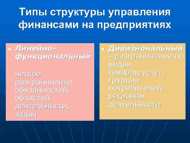 Типы структуры управления финансами на предприятиях n Линейно- n Дивизиональный функциональный - разграничение по - видам четкое товаров, услуг, разграничение группам обязанностей, потребителей, областей регионам деятельности, деятельности задач