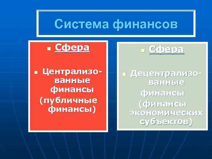 Система финансов n Сфера n Централизо- n Децентрализо- ванные финансы (публичные (финансы финансы) экономических субъектов)